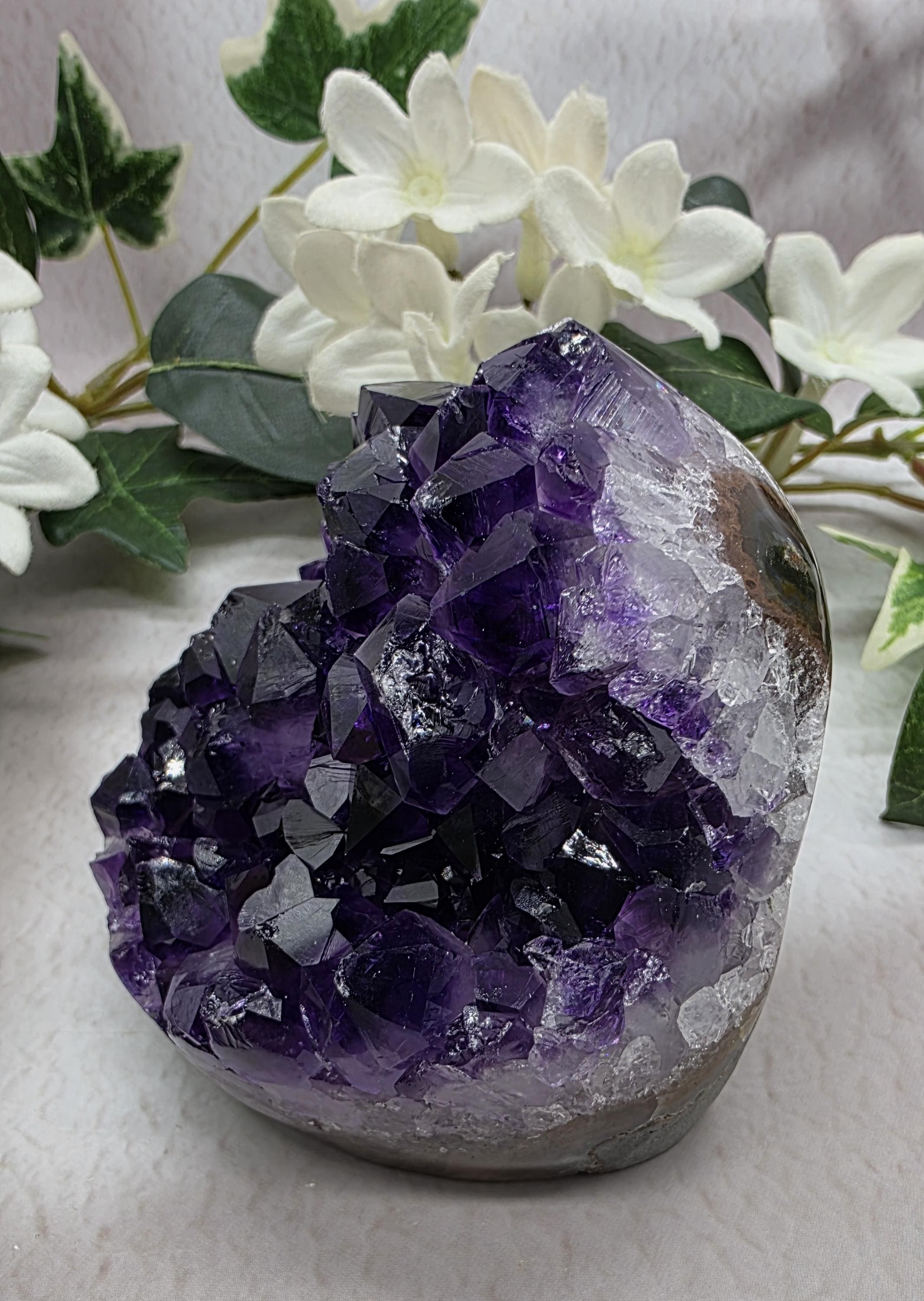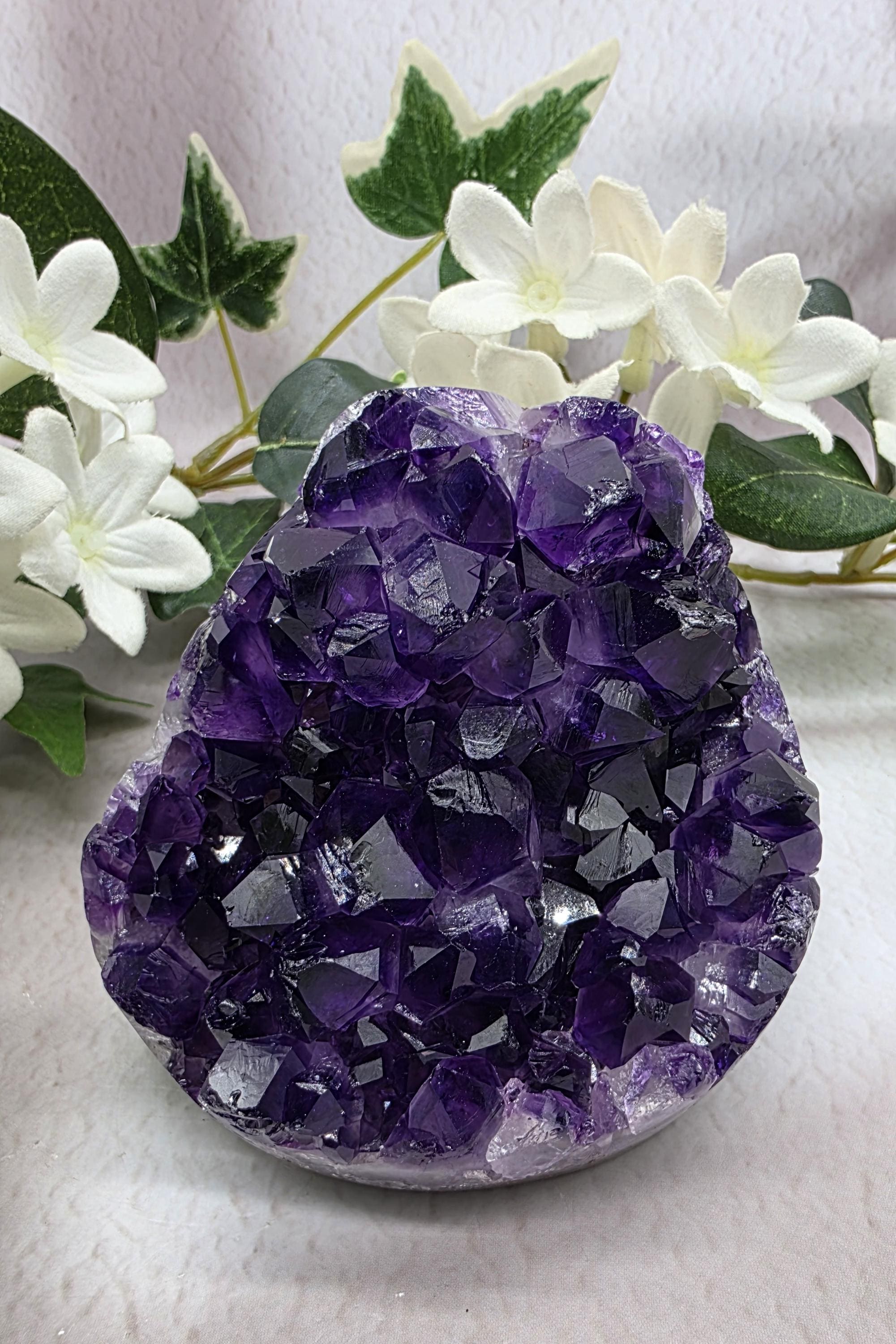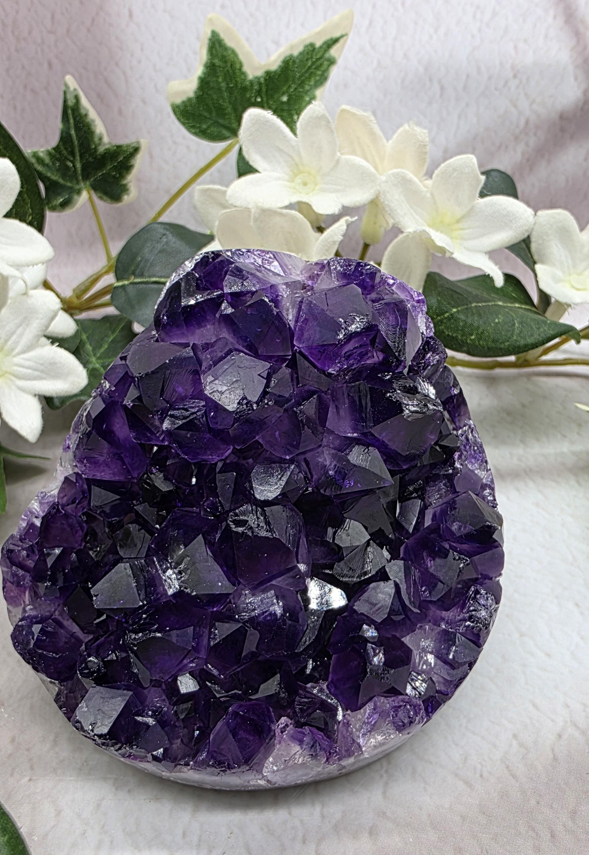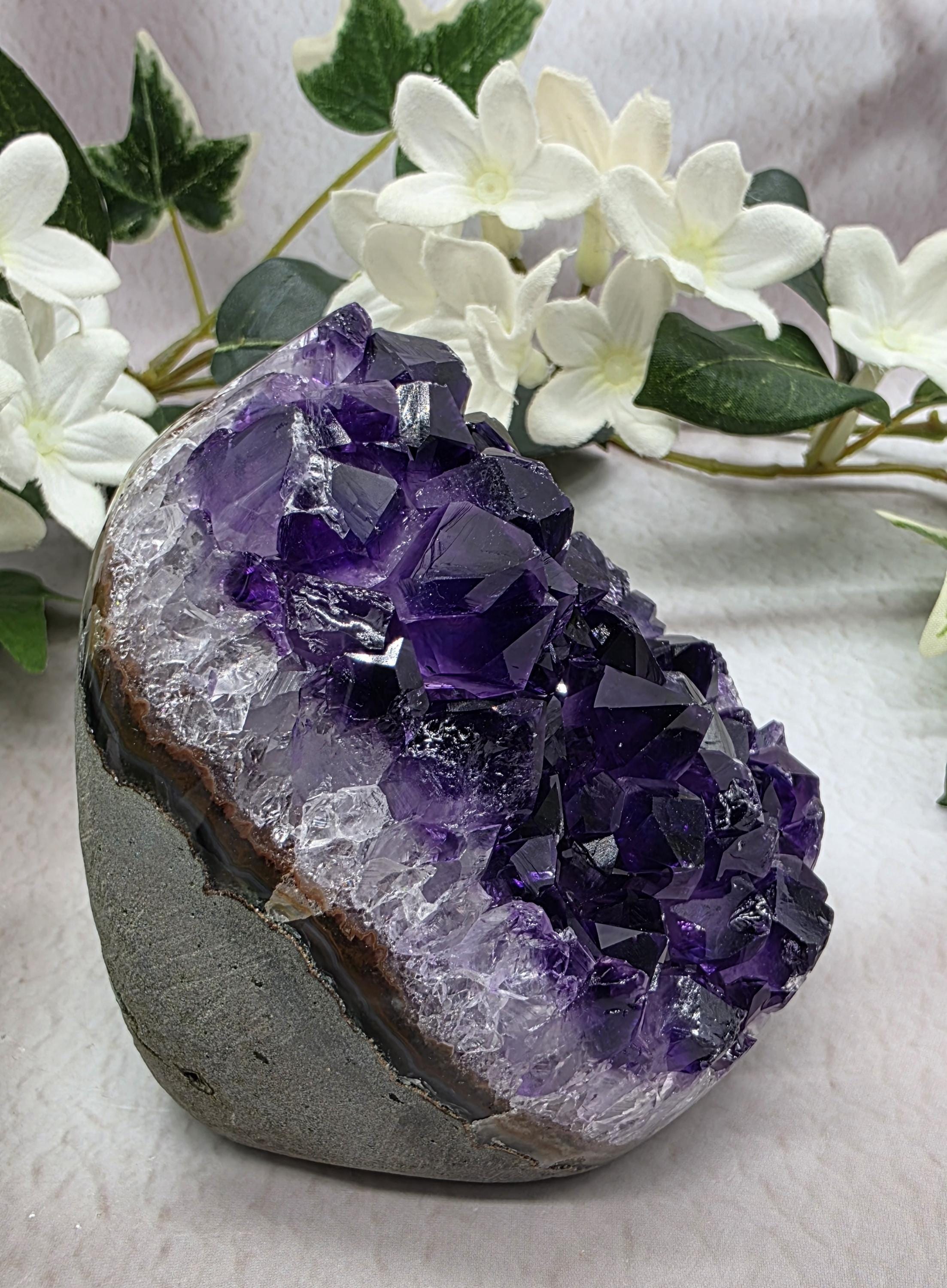 With its cut base design, this geode stands beautifully on its own, showcasing sparkling crystal points that radiate brilliance from every angle. The dark, saturated purple hues and pristine clarity of the crystals mark it as top quality—Grade AAA, a level rarely offered in such a compact and display-ready piece.