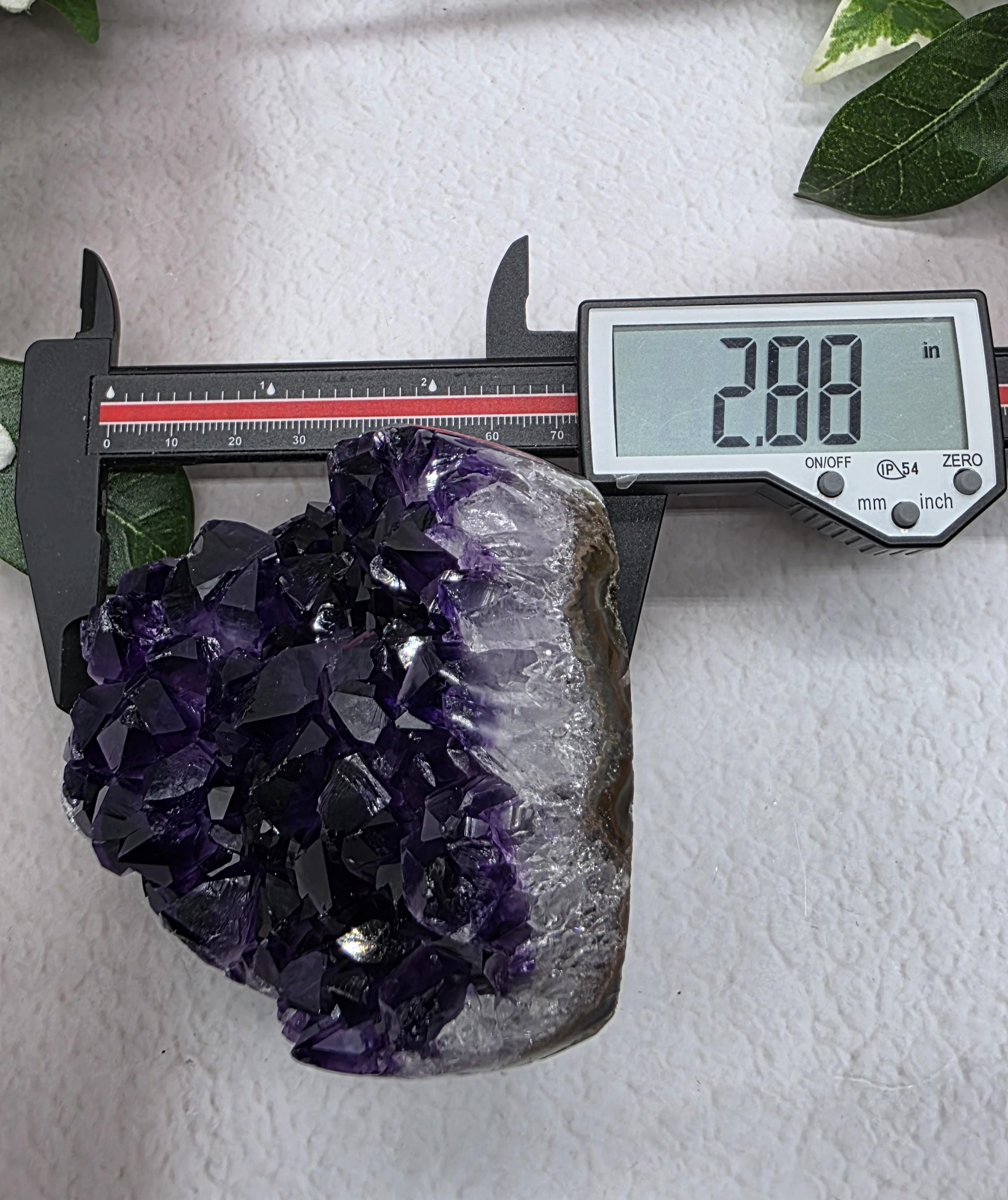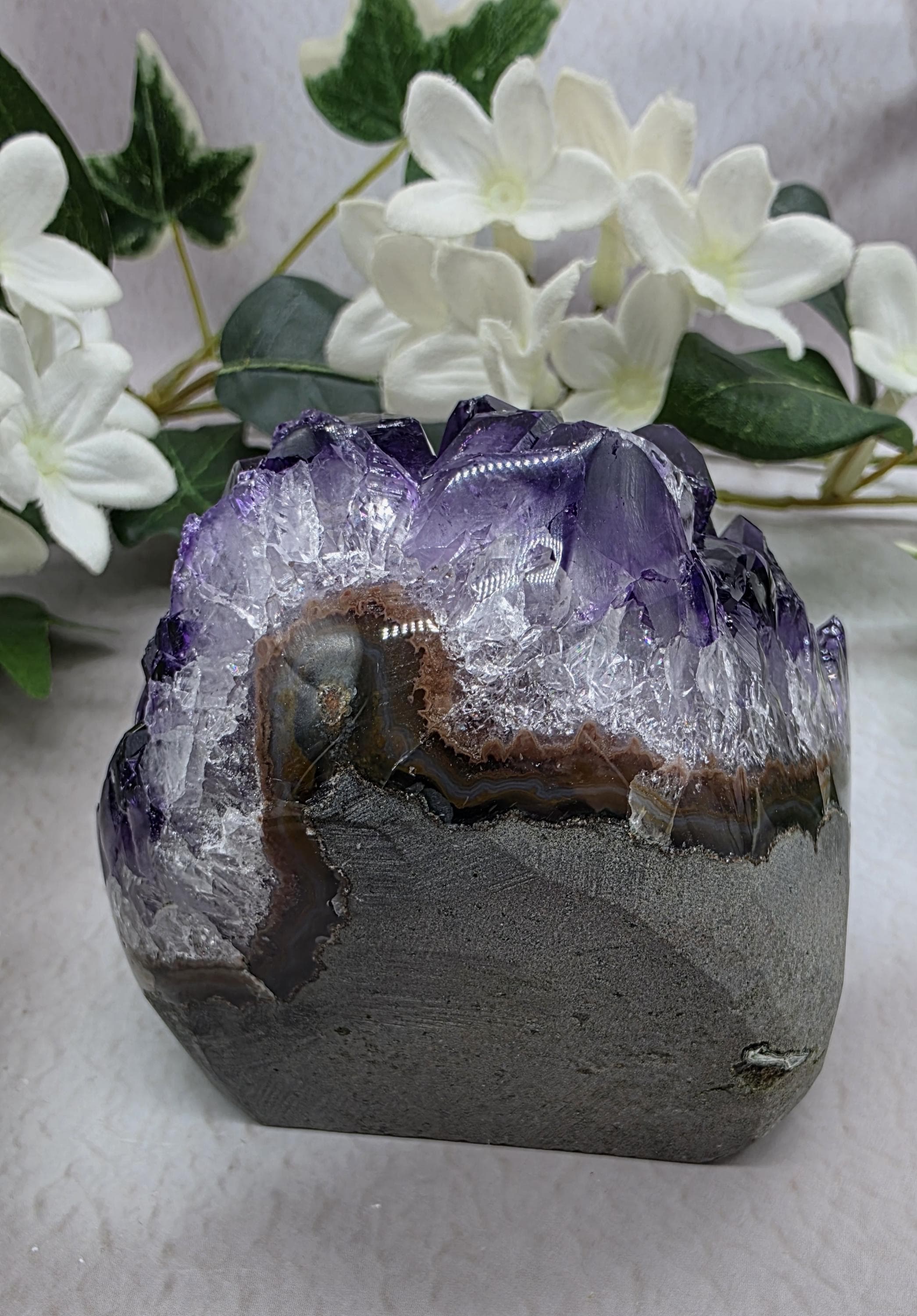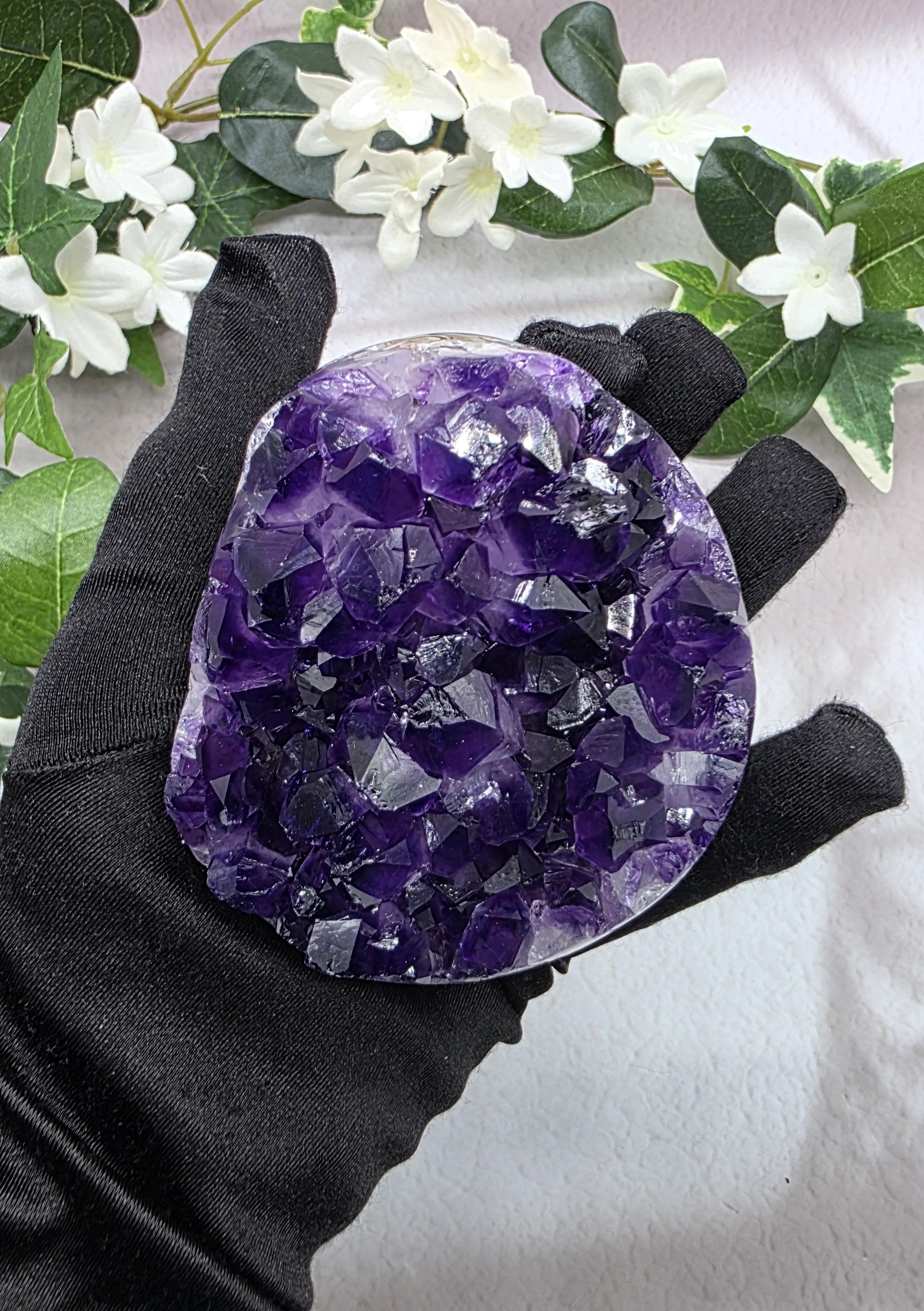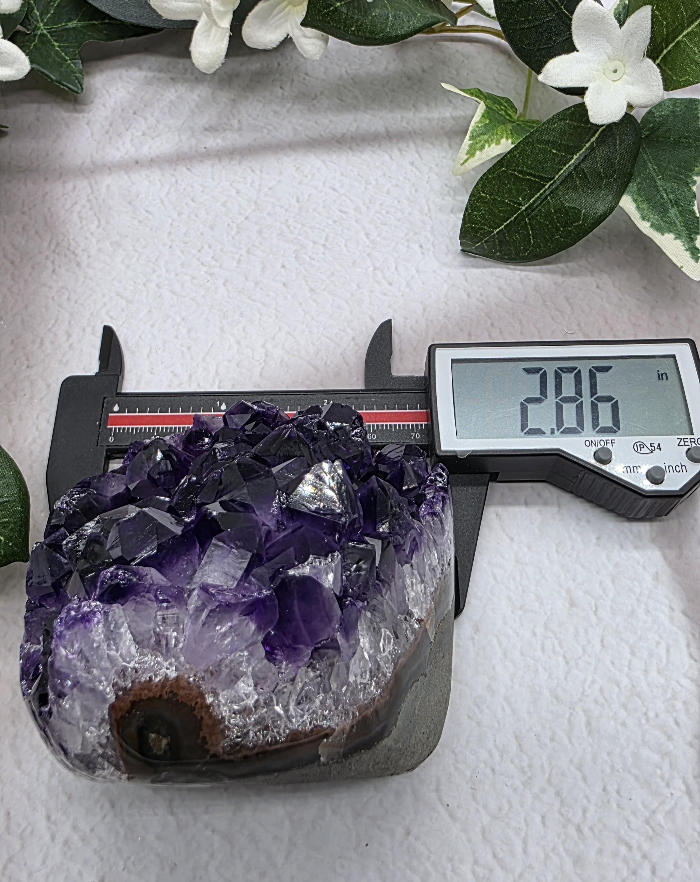 With its cut base design, this geode stands beautifully on its own, showcasing sparkling crystal points that radiate brilliance from every angle. The dark, saturated purple hues and pristine clarity of the crystals mark it as top quality—Grade AAA, a level rarely offered in such a compact and display-ready piece.