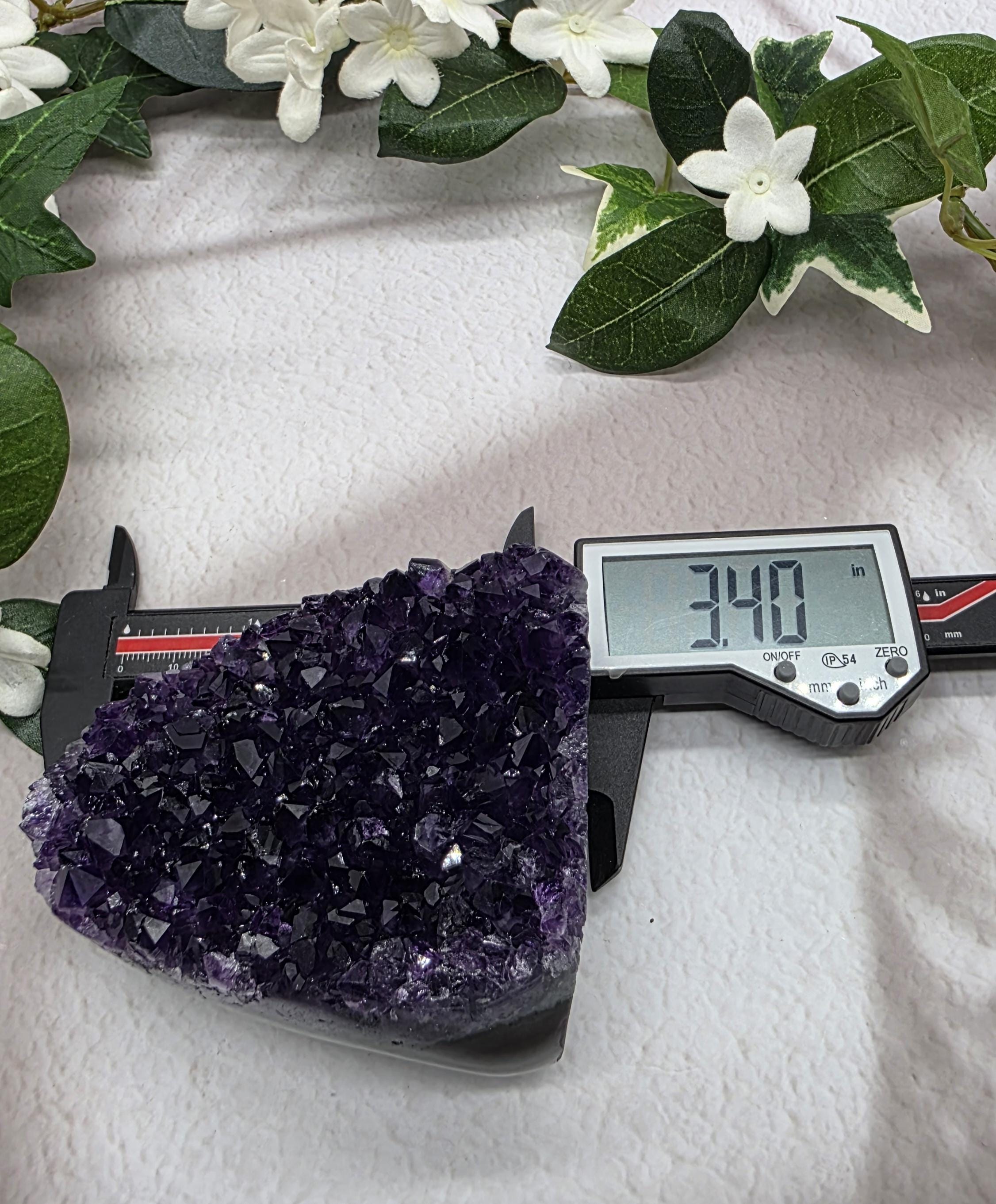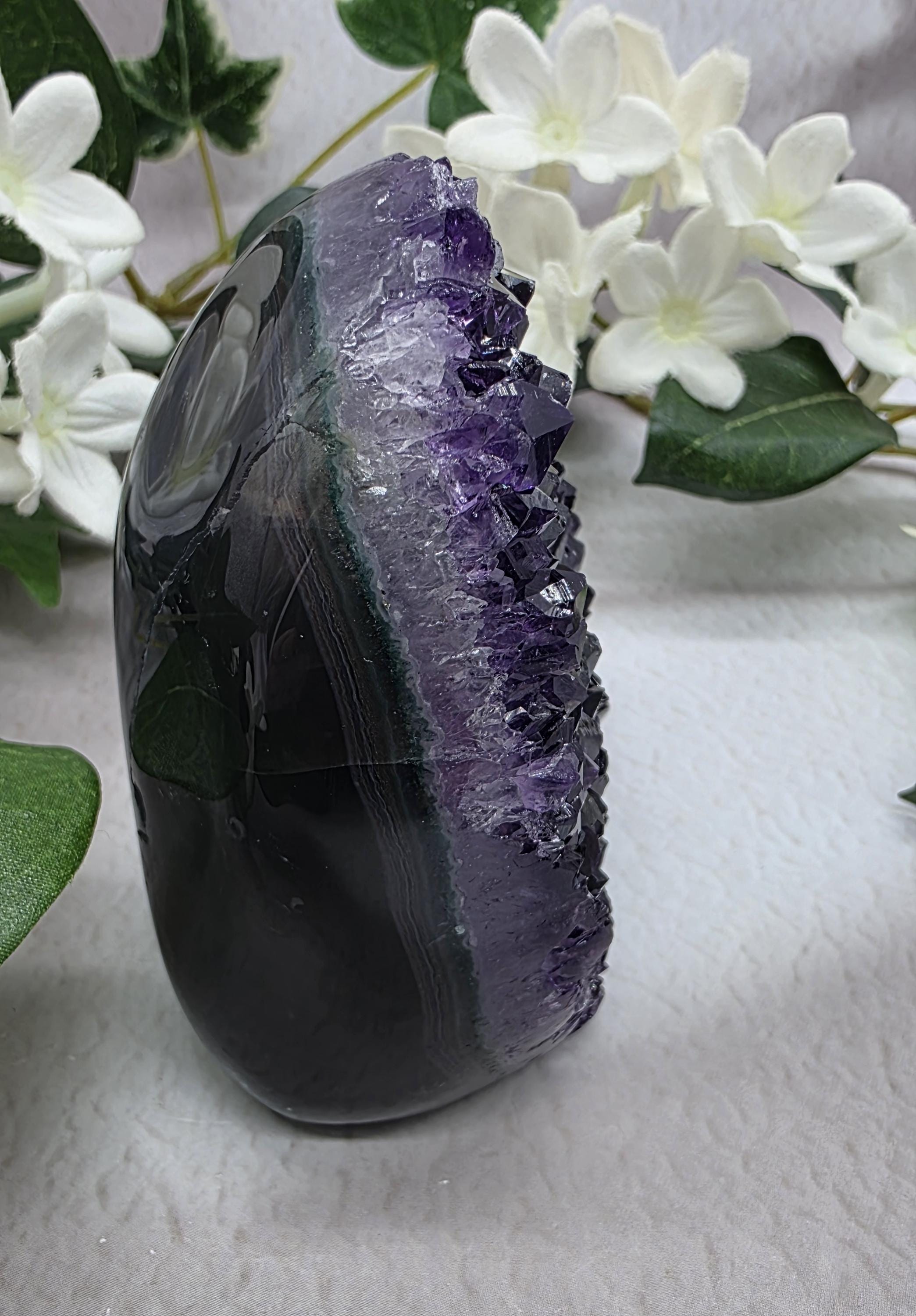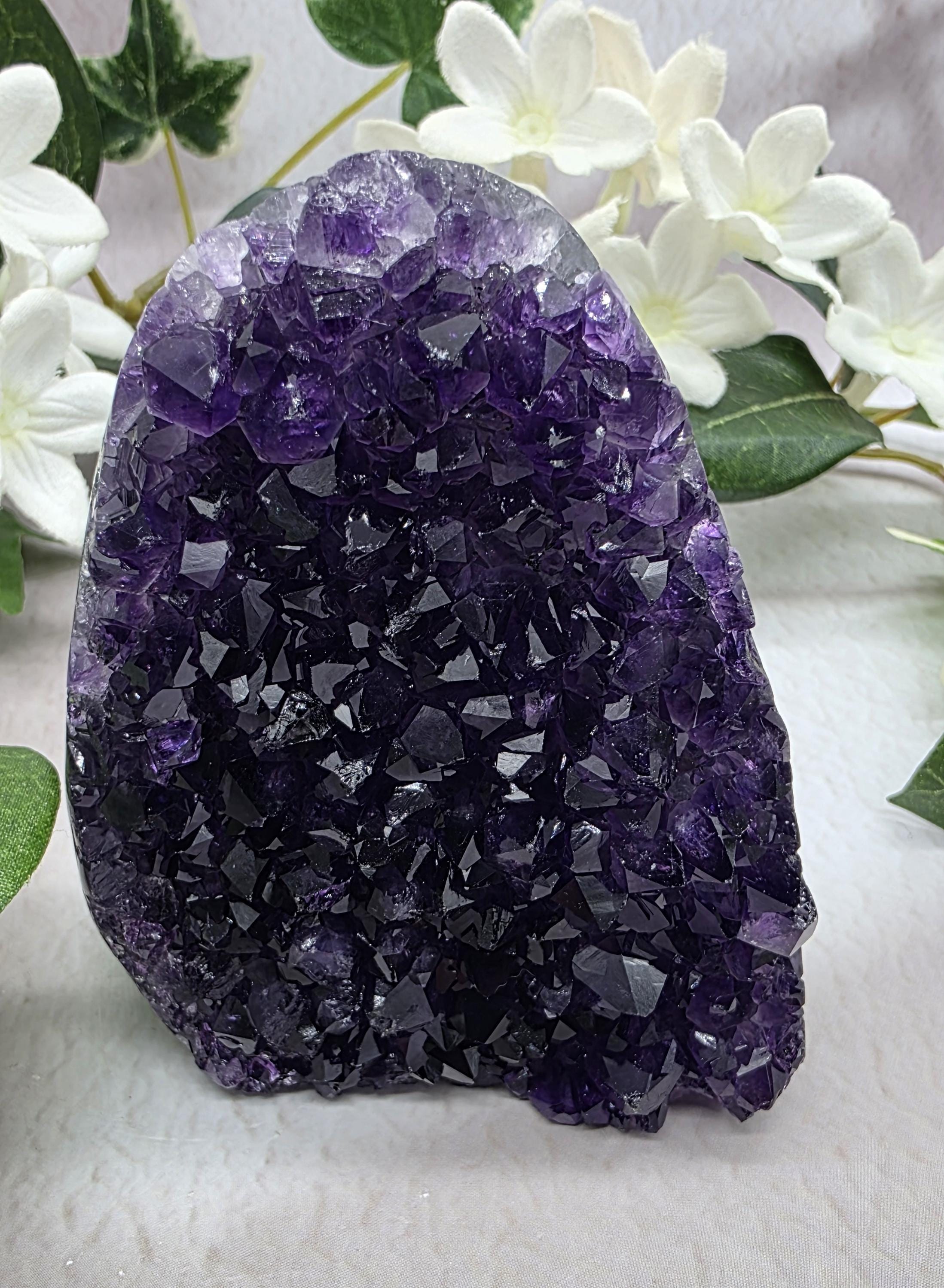 With its cut base design, this geode stands beautifully on its own, showcasing sparkling crystal points that radiate brilliance from every angle. The dark, saturated purple hues and pristine clarity of the crystals mark it as top quality—Grade AAA, a level rarely offered in such a compact and display-ready piece.