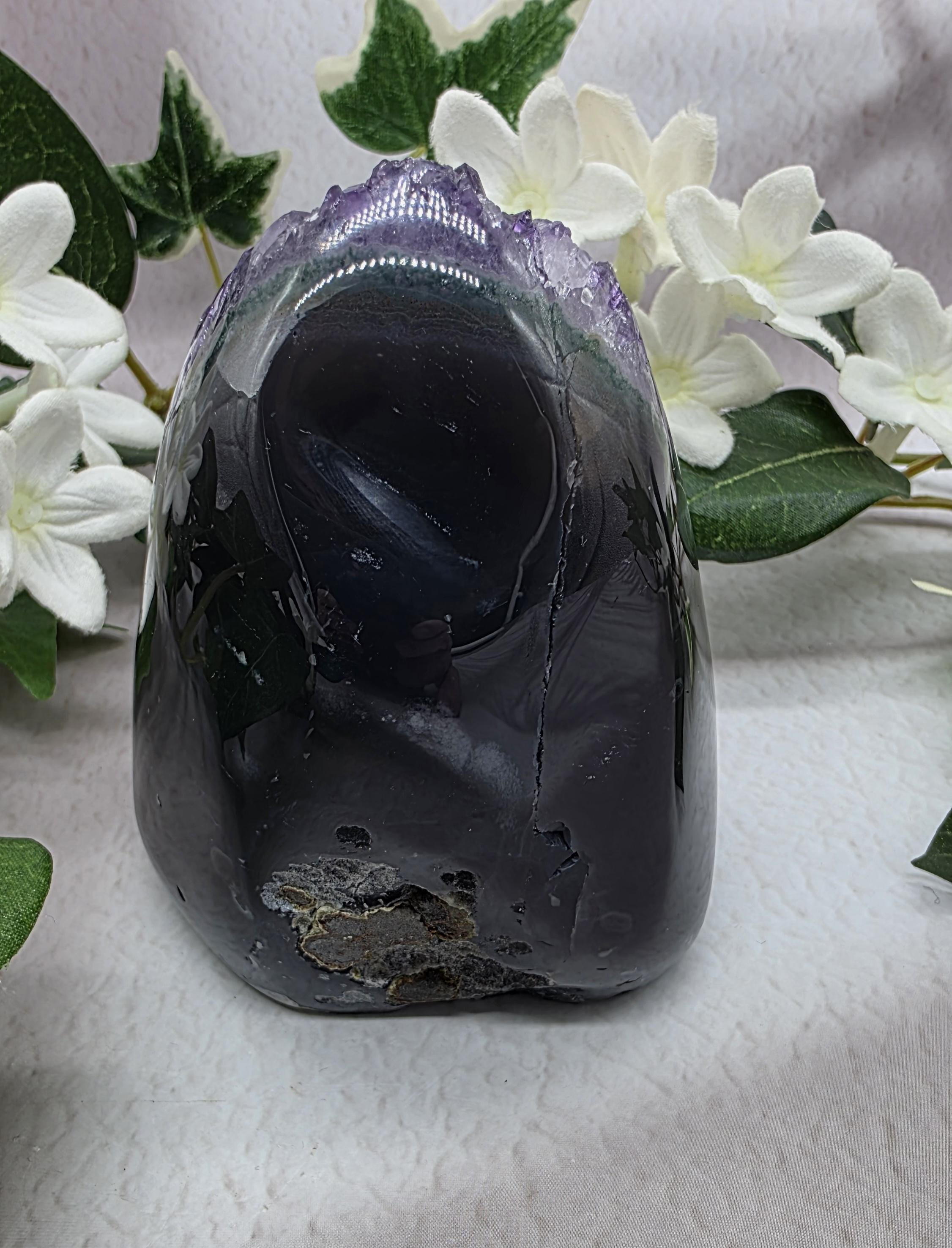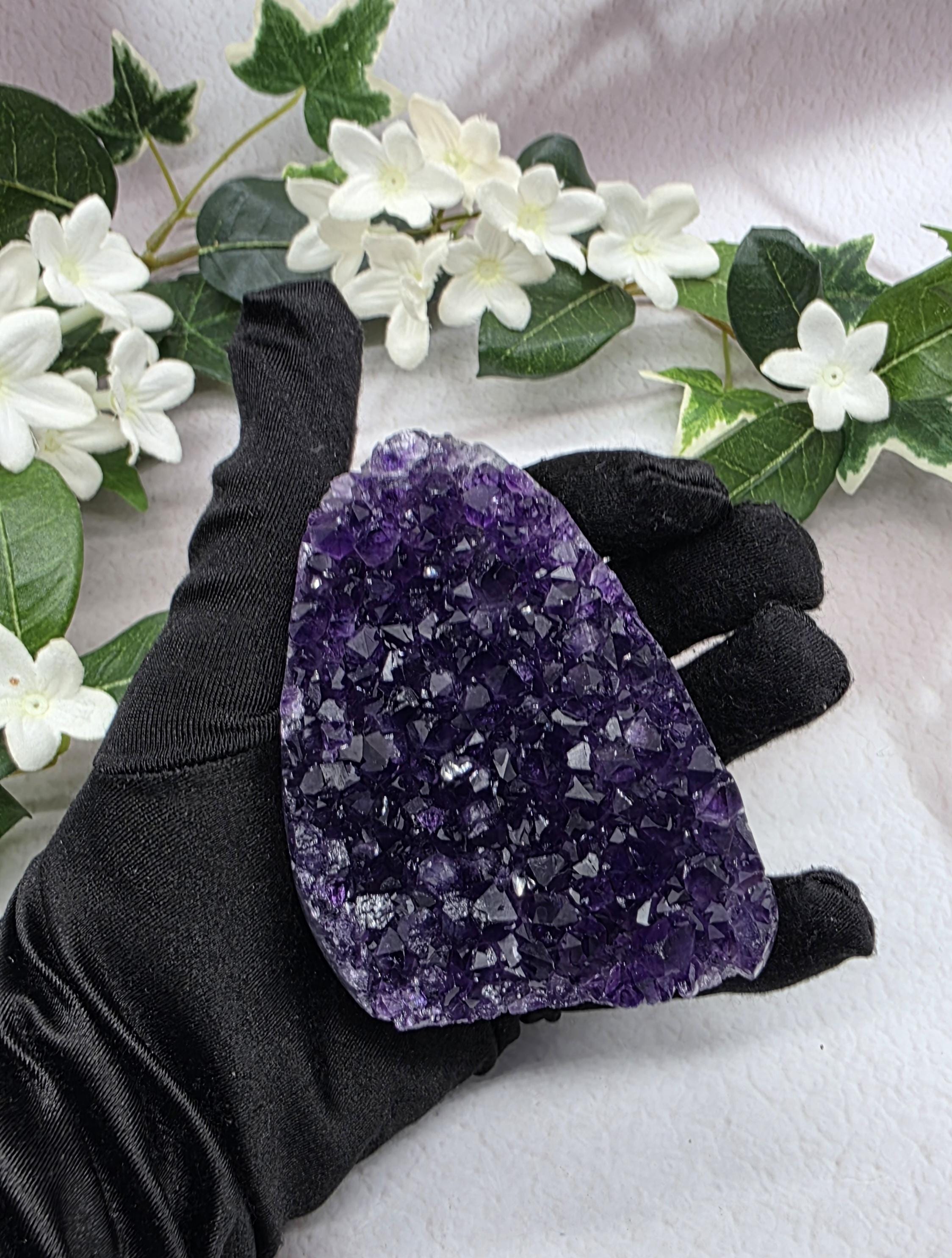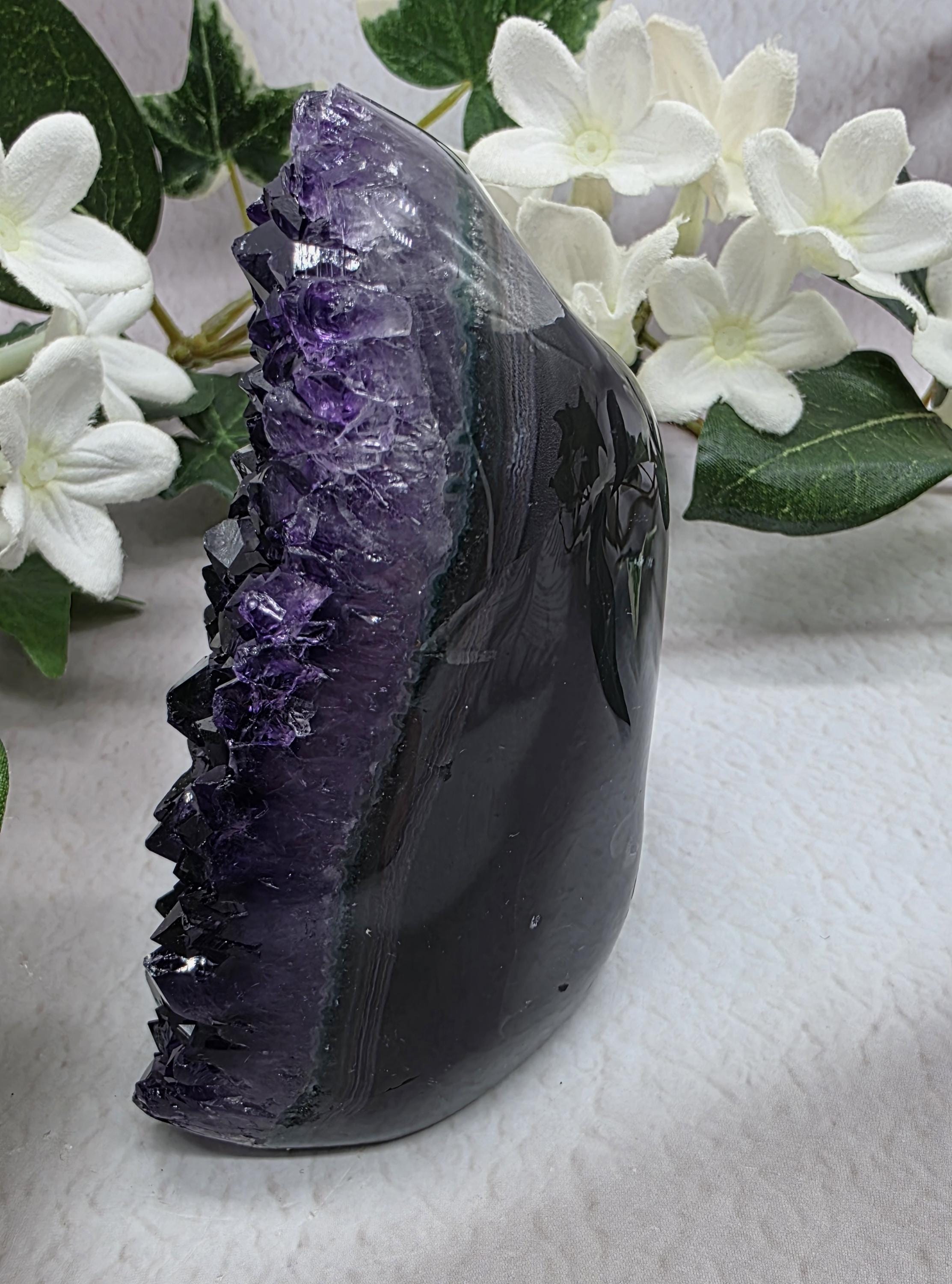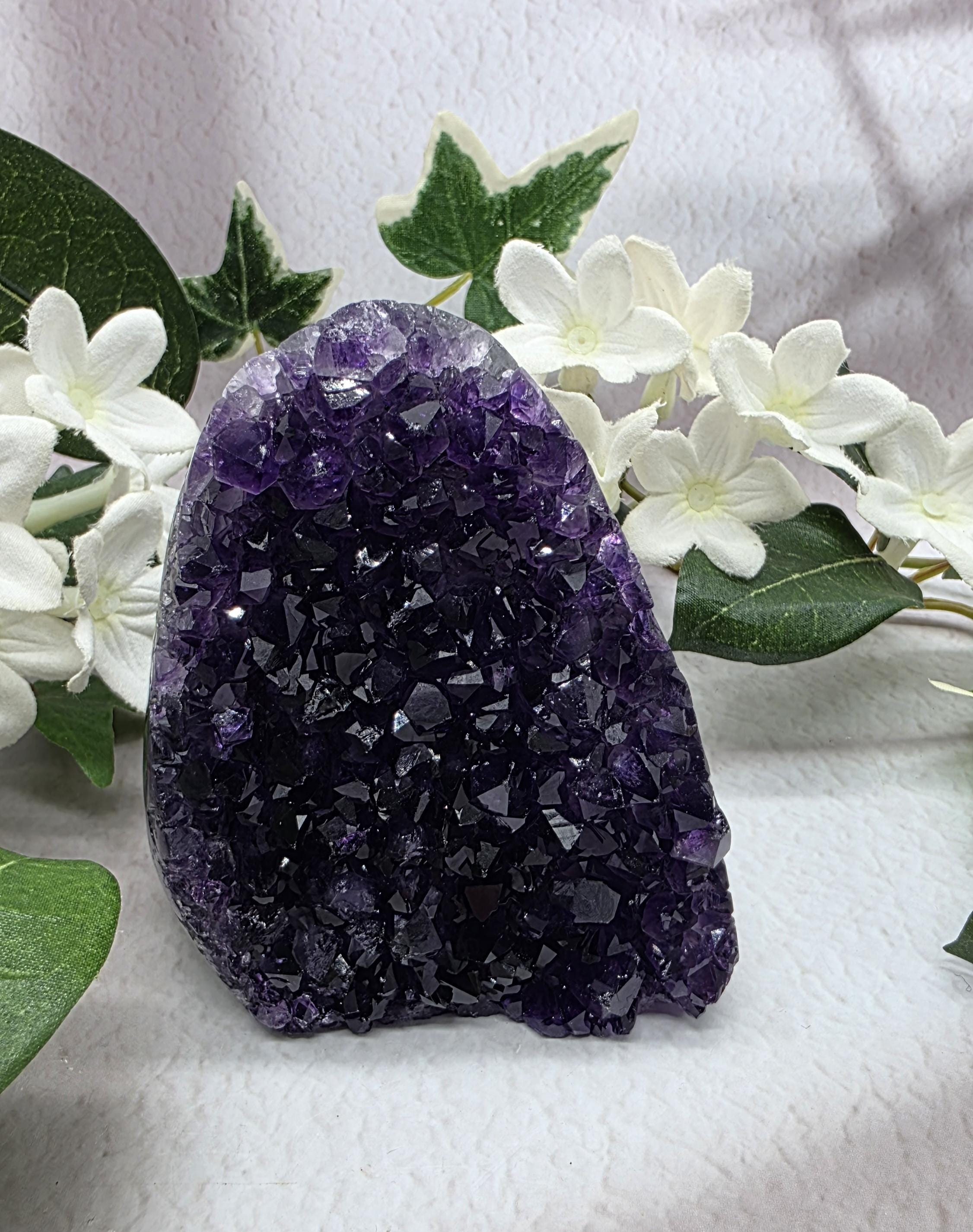 With its cut base design, this geode stands beautifully on its own, showcasing sparkling crystal points that radiate brilliance from every angle. The dark, saturated purple hues and pristine clarity of the crystals mark it as top quality—Grade AAA, a level rarely offered in such a compact and display-ready piece.